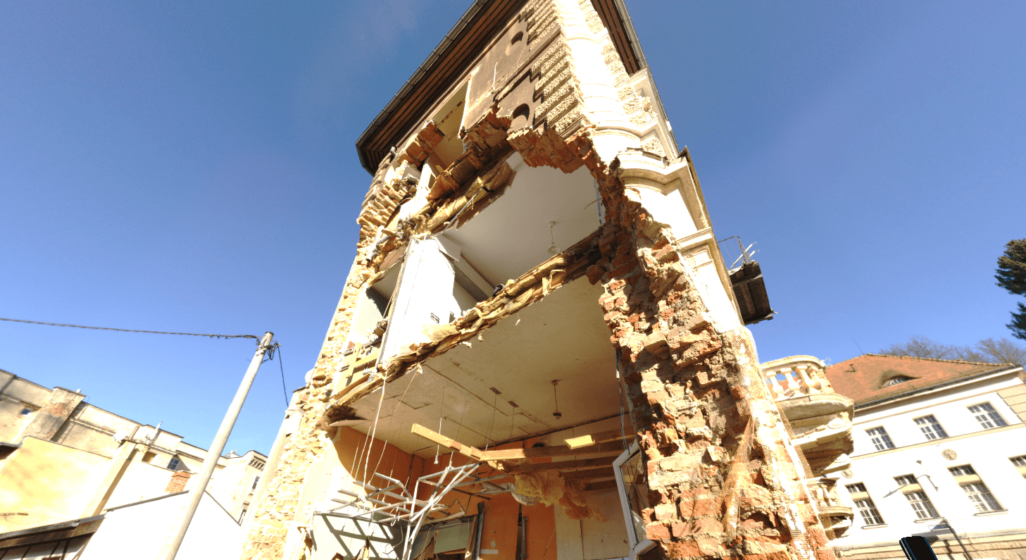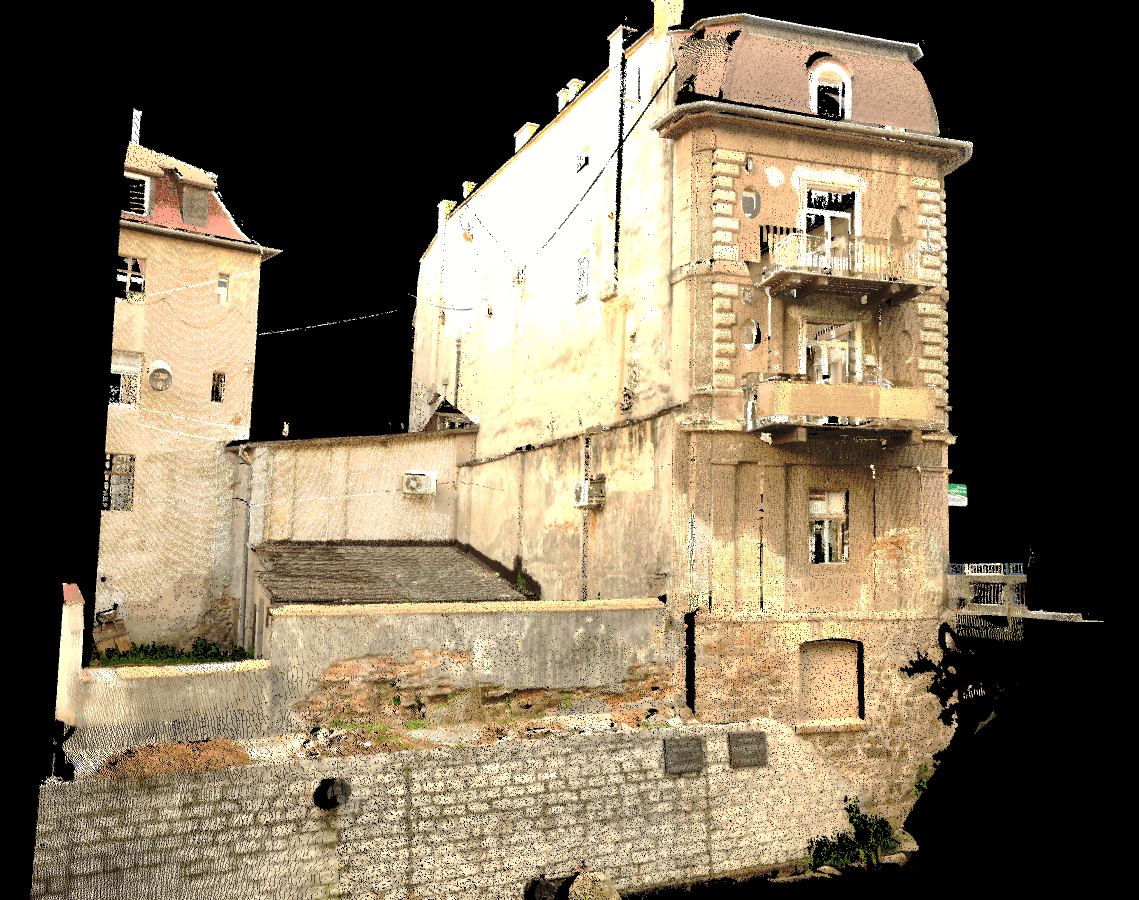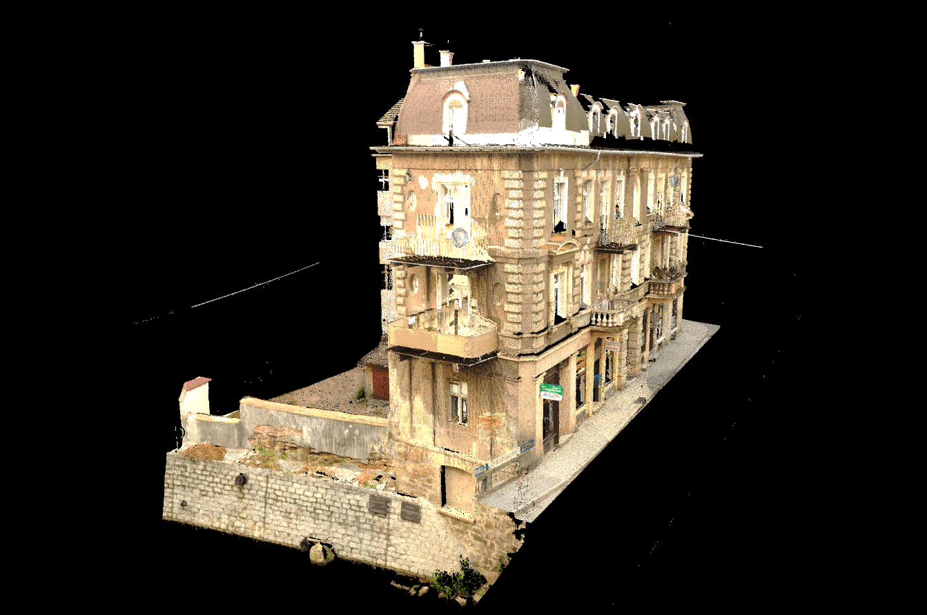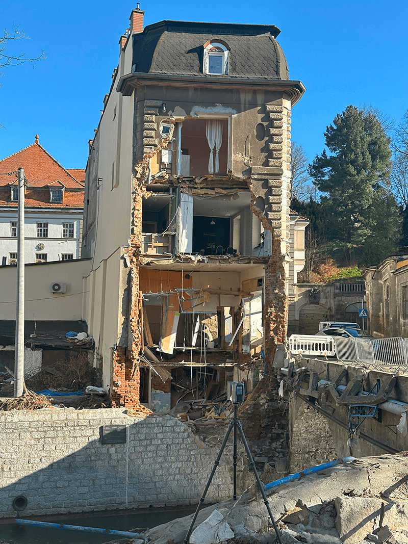 Ostatnio wykonaliśmy szczegółowe skanowanie 3D budynku, dokumentując jego obecny stan. Niestety, elewacja od strony Białej Lądeckiej została poważnie uszkodzona, ponieważ kamienica znajduje się na zakręcie rzeki, gdzie napór wody był największy. Na szczęście mamy też skan sprzed kilku lat, co pozwala nam na precyzyjne porównanie obu chmur punktów i analizę zmian, takich jak deformacje i utrata elementów konstrukcyjnych.